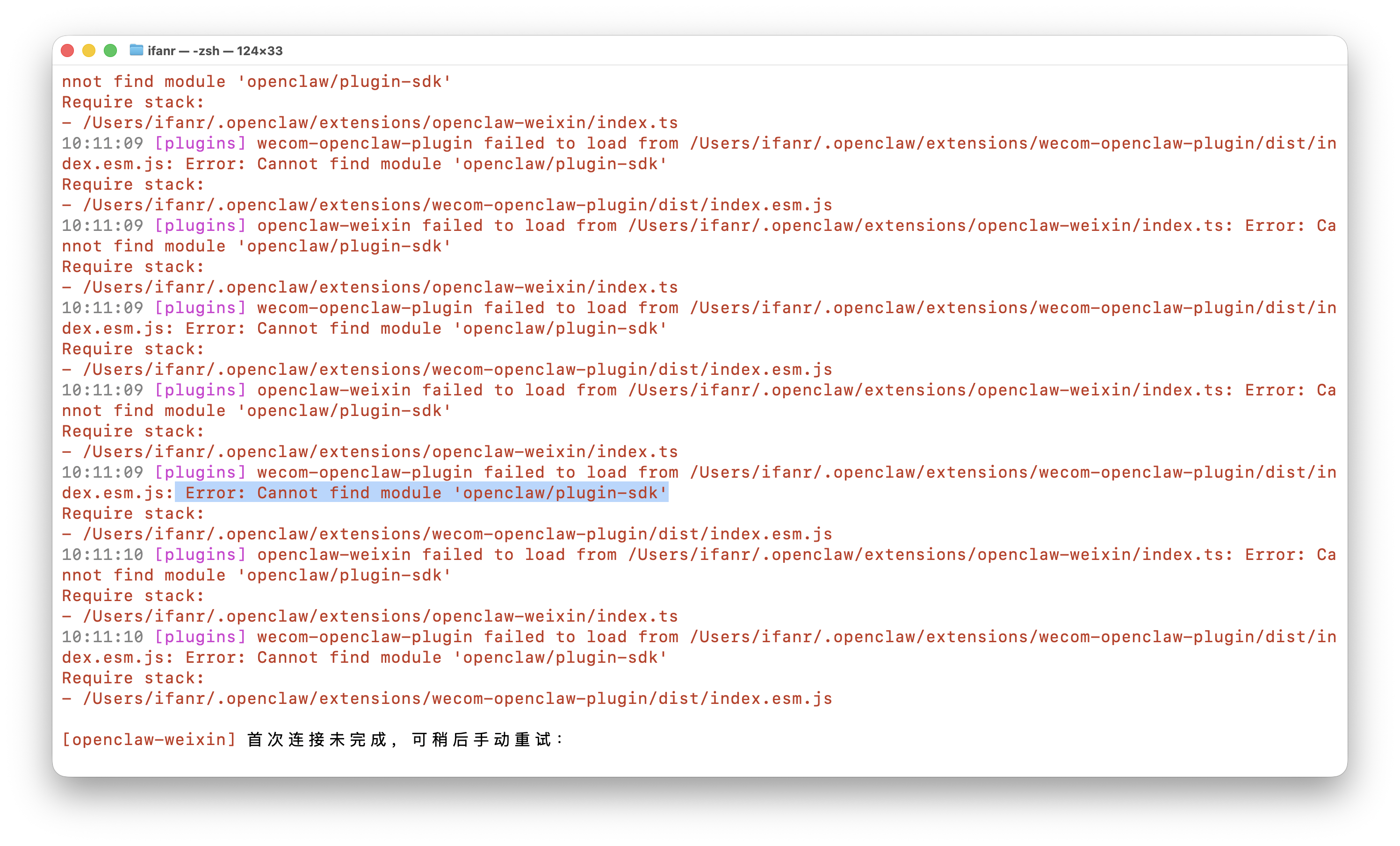 在我们按照微信官方的 Clawbot 插件提示,重新在终端里输入命令安装 Clawbot 时,开始像 OpenClaw 的运行日志里面,报出找不到相关模块的问题。