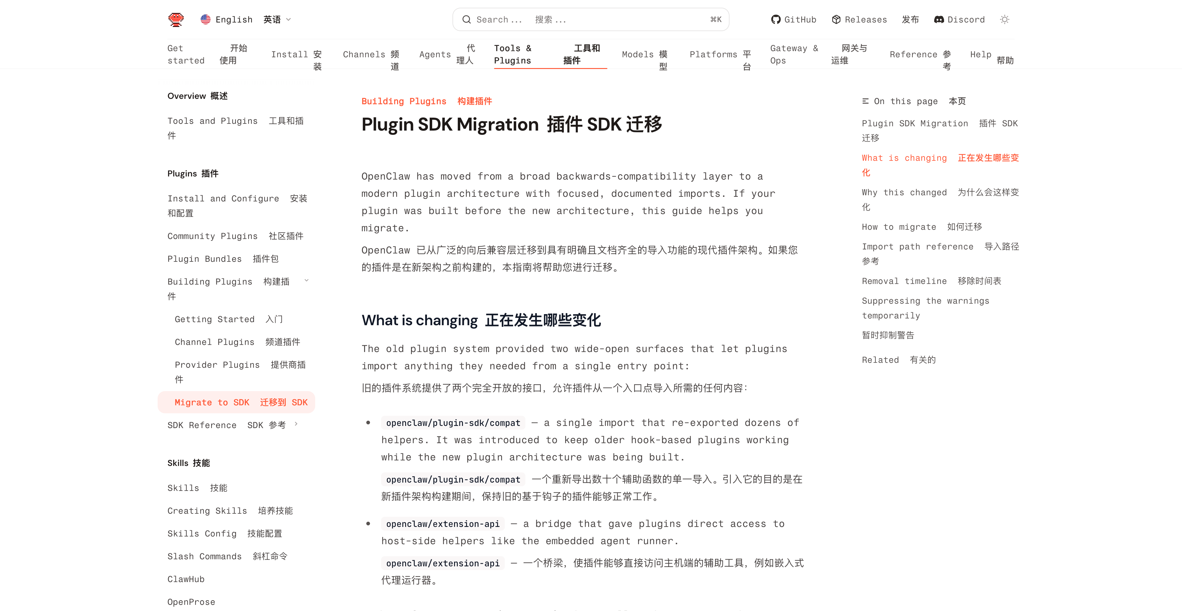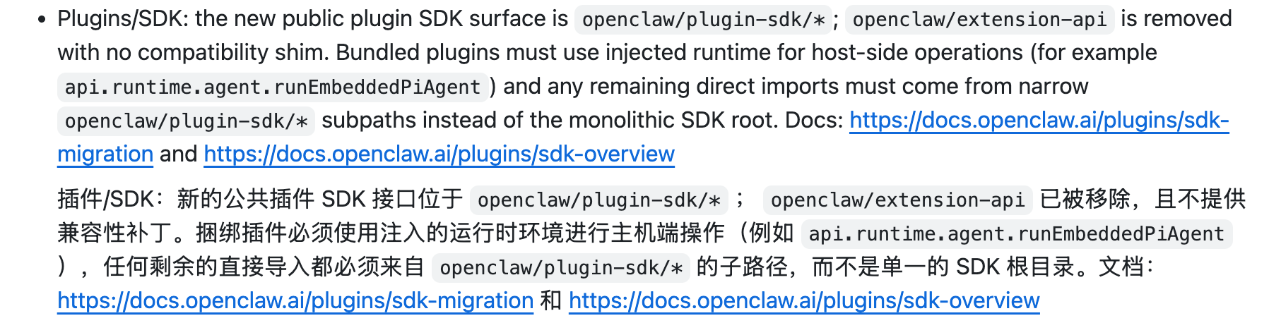▲OpenClaw 的插件更新,提到了为什么要改变,做了哪些改变,以及插件开发者如何修改的指引