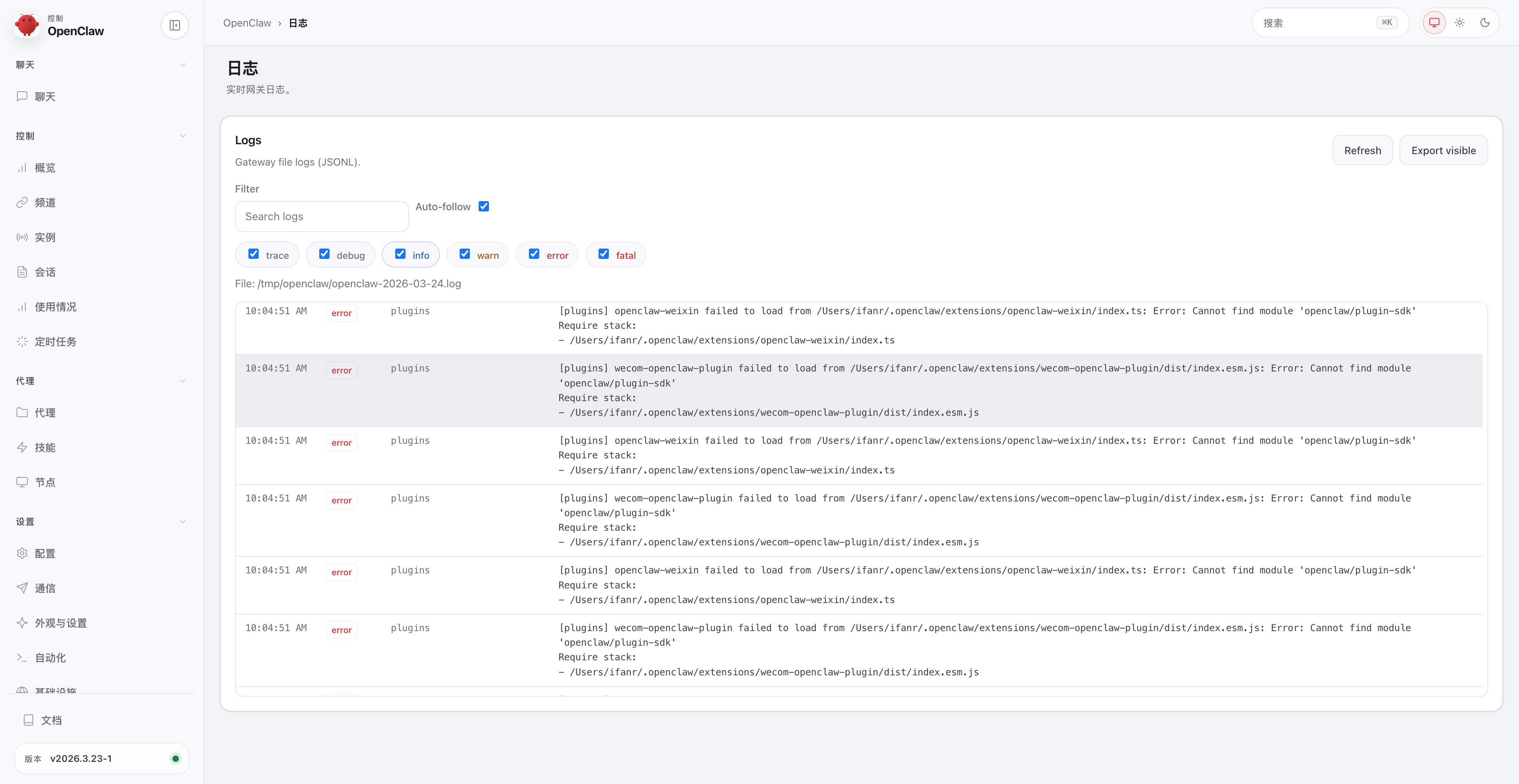查看 OpenClaw 的官方日志,我们发现,在微信里发给 Clawbot 的信息,完全不能同步到 OpenClaw 处理。反而好几条都是 error 的报错信息,提示找不到 OpenClaw 的 plugin-sdk 的模块。