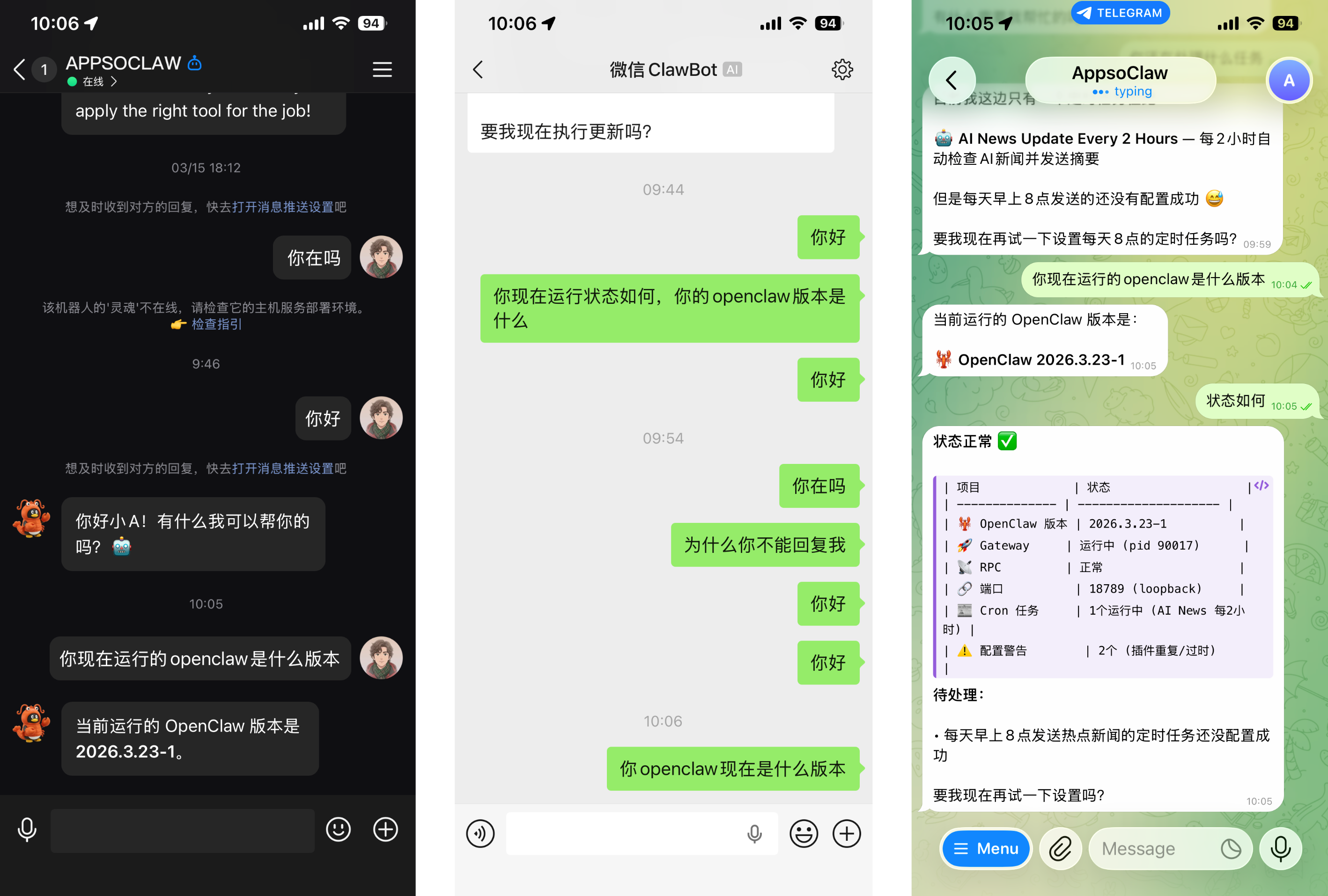 ▲我们在从 3.13 版本更新到 3.23 的过程中,腾讯系的 qqbot、企业微信和微信几乎都遇到了类似的警告。