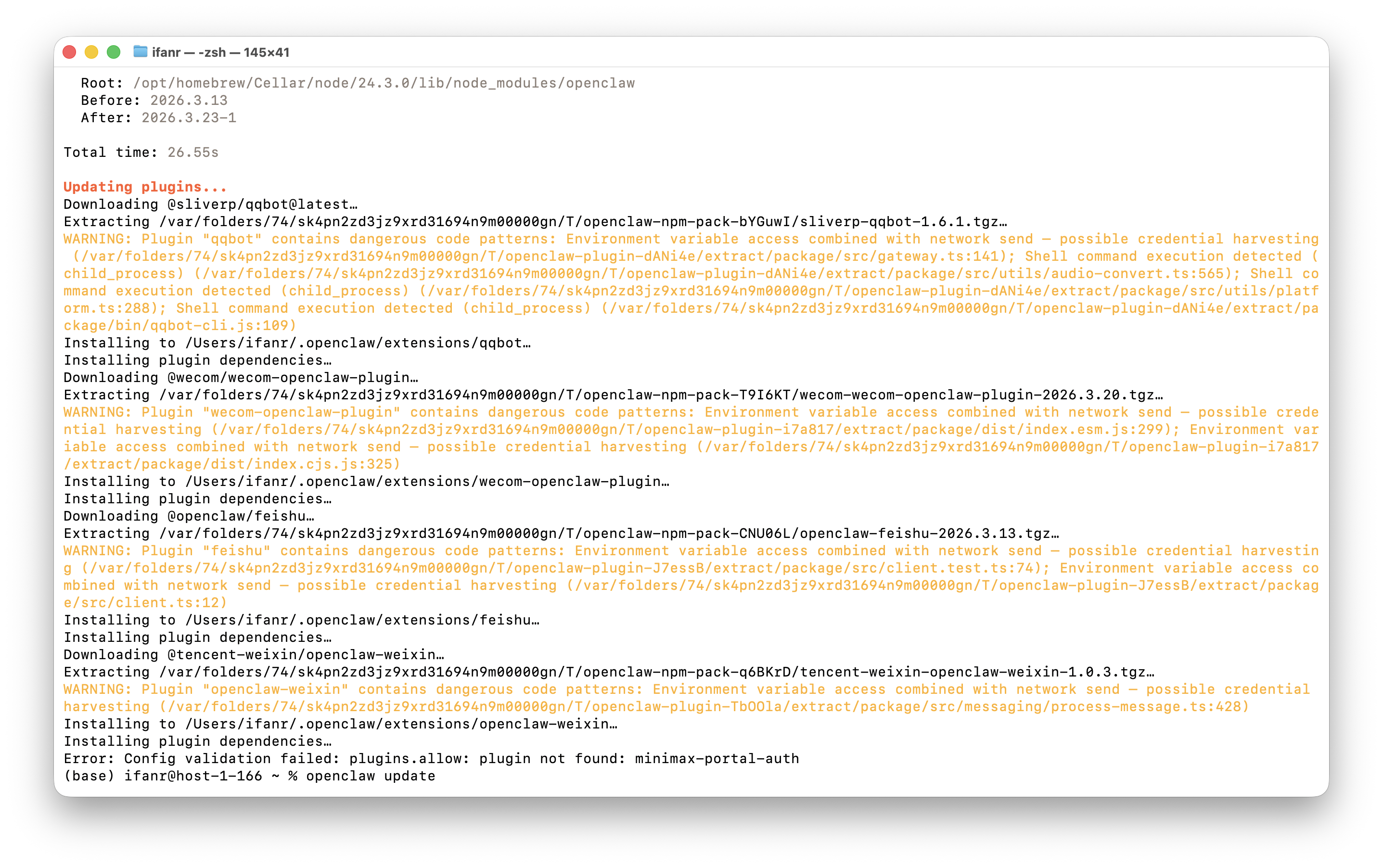 当我们尝试把手边的 OpenClaw 更新到最新版本时,果然在更新的过程中,就接连报出好几个警告。