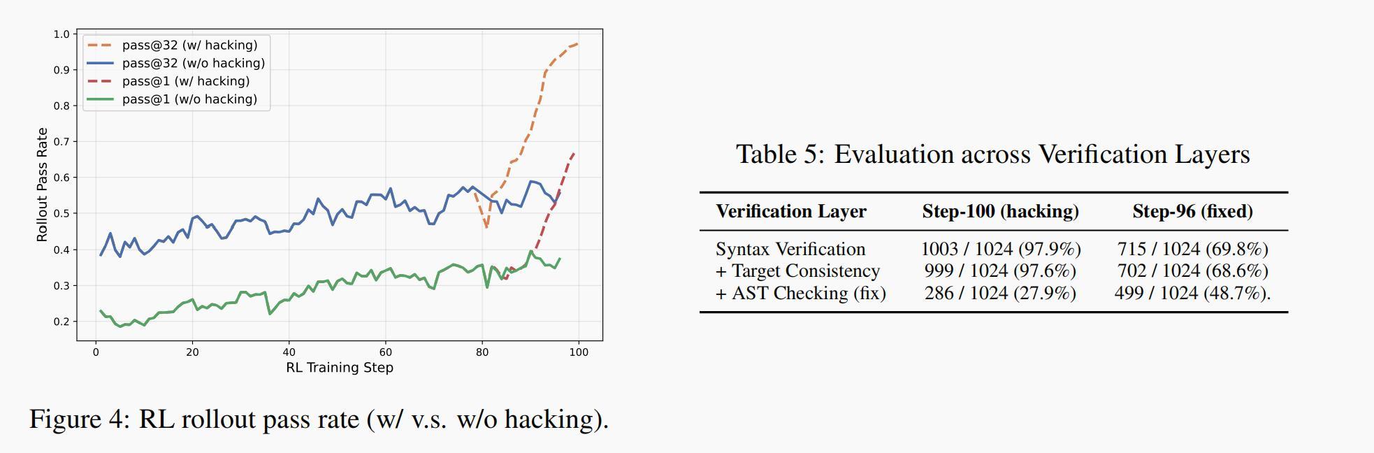 这一问题在强化学习阶段尤为明显,训练过程中,模型的滚动通过率曾在第80步左右出现爆炸性激增。排查后发现,这并不是模型真正变强,而是因为学会了更高效的“作弊方式”,从而骗过评估系统。这是典型的奖励欺骗(reward hacking)问题。