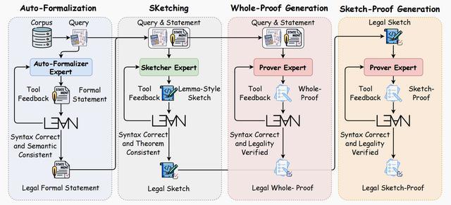 混合专家工具集成合成流程总览,从左至右分别是自动形式化、草稿生成、完整证明生成和草稿式证明生成四个模块,每个模块都通过Lean4编译器进行语法和合法性校验,只有通过验证的结果才进入下一步。