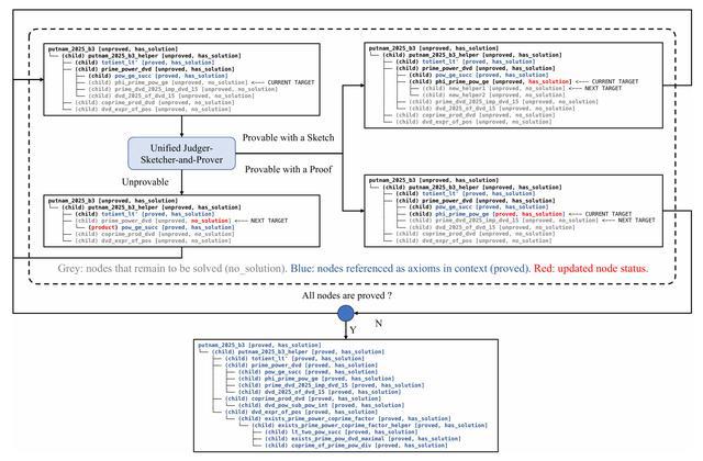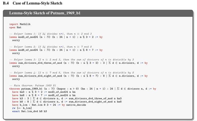 这一过程由专门的草稿生成专家模型(记为πθsk)完成。给定已经验证正确的形式化语句sx,模型不会立刻输出完整证明,而是先构建一个包含多个辅助引理(lemma)的证明框架。这个草稿通常由若干尚未完成的小结论和一个整体证明结构组成,其中未完成的部分会以占位形式标记出来。这样的设计本质上借鉴了“分而治之”和动态规划的思想:把一个困难问题拆分成多个更容易解决的小问题。