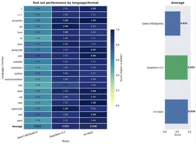基准测试方面,aiX-apply模型在Python、Java、JavaScript、C++等主流编程语言,以及JSON、Markdown等多类型文件格式的测试中,平均准确率达到93.8%,超越Qwen3-4B基座模型62.6%的准确度,甚至高于千亿级大模型DeepSeek-V3.2。