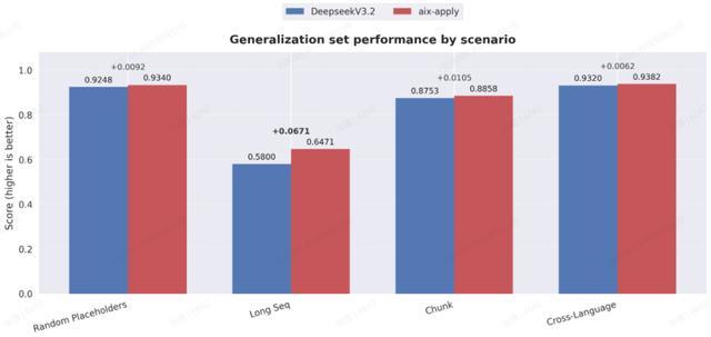 结果表明,aiX-apply模型通过专门的强化学习训练,在多维度泛化性测评场景中,其准确性和稳定性可以与DeepSeek V3.2比肩。