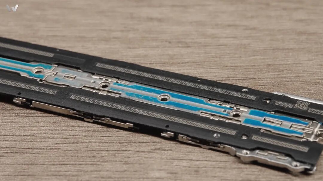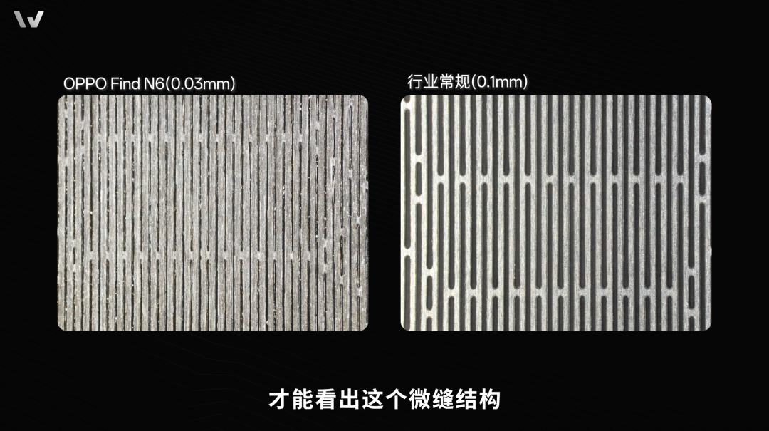 一方面,Find N6 的支撑网虽然还是传统的金属材质,但用上了三星同款的蚀刻工艺,将支撑网的开缝宽度从 0.1mm 缩小到了约 0.03mm: