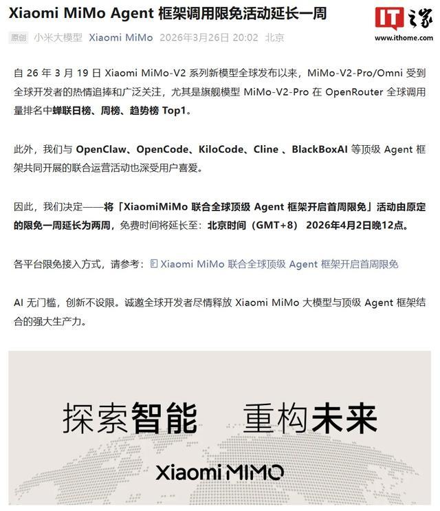 IT之家 3 月 26 日消息,小米“Xiaomi MiMo”官方公众号今日宣布,将「XiaomiMiMo 联合全球顶级 Agent 框架开启首周限免」活动由原定的限免一周延长为两周,免费时间将延长至北京时间 2026 年 4 月 2 日晚 12 点。