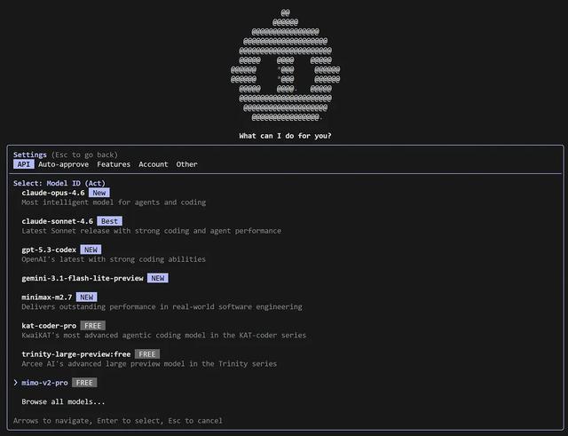 在终端界面及 IDE 扩展等编辑器中,选择 Cline 作为 Provider,并选择 mimo-v2-pro 模型(FREE 标记)。